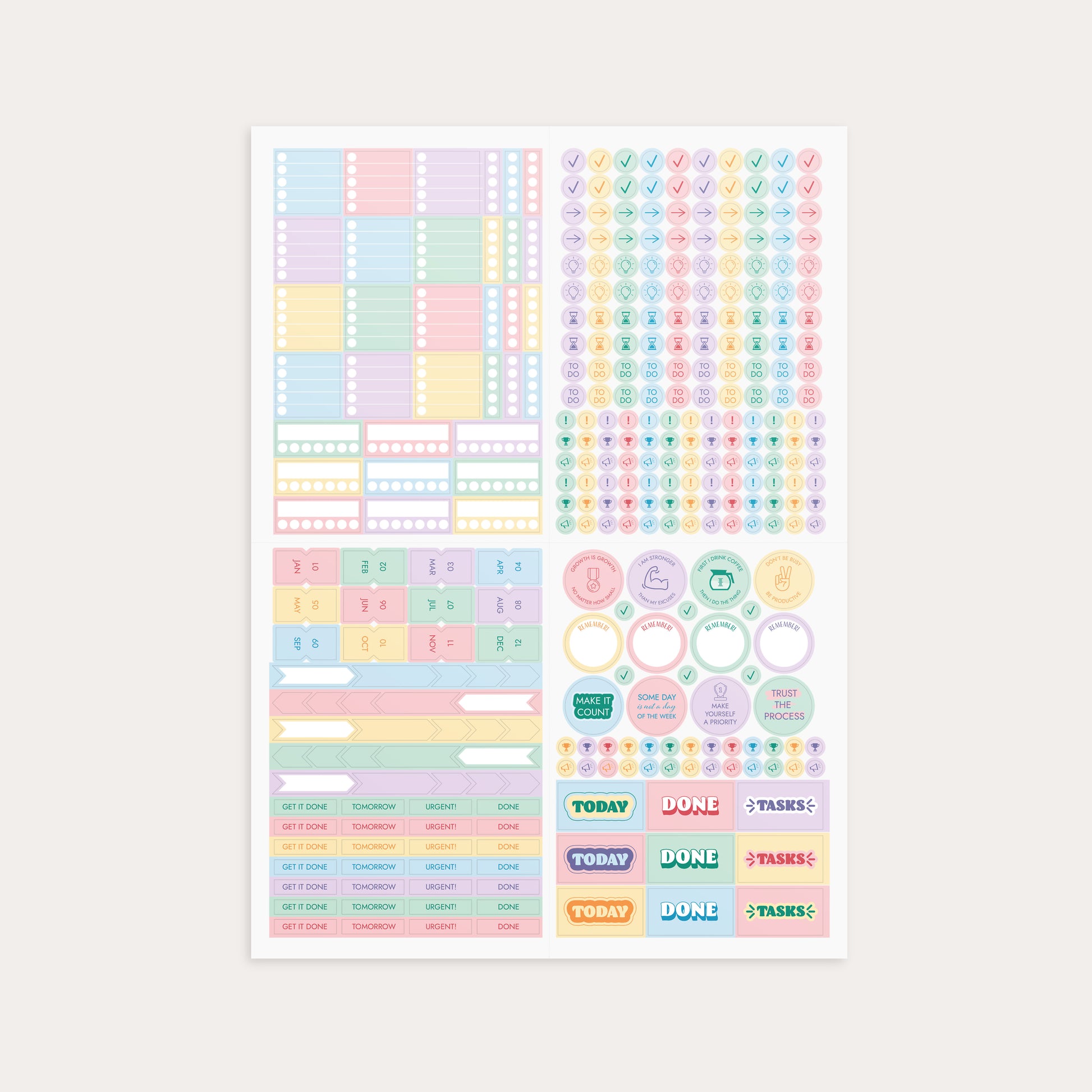 Håll produktiviteten på topp och ha stenkoll på dina att göra listor med det här stickersarket i mjuka pastellfärger. Finns även i en variant med lite mörkare färger.