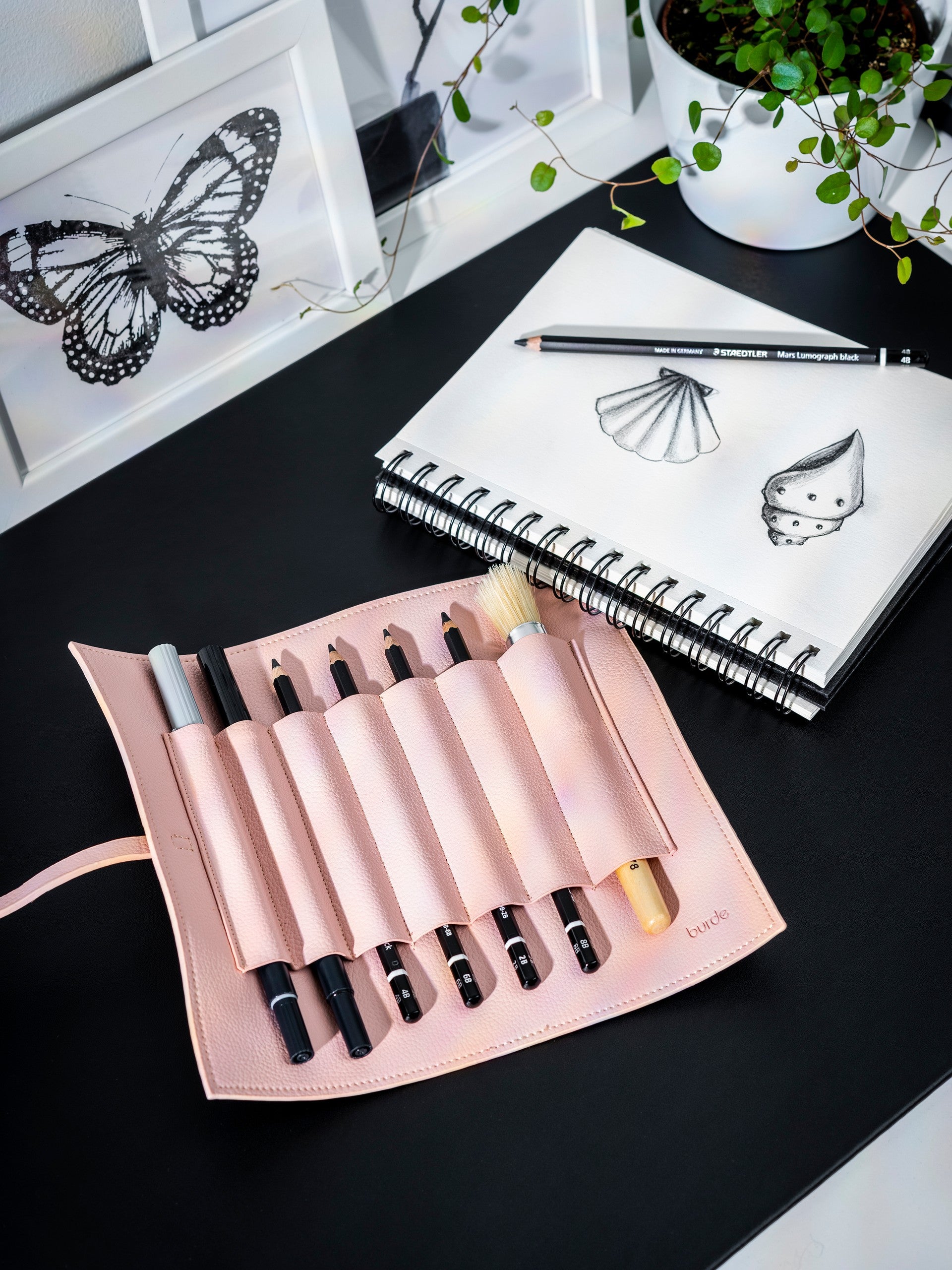 Pencil case in soft faux leather with drawstring. The pencil case has room for 6 standard sized pens and then a larger pocket for wider pens, brushes or erasers.
