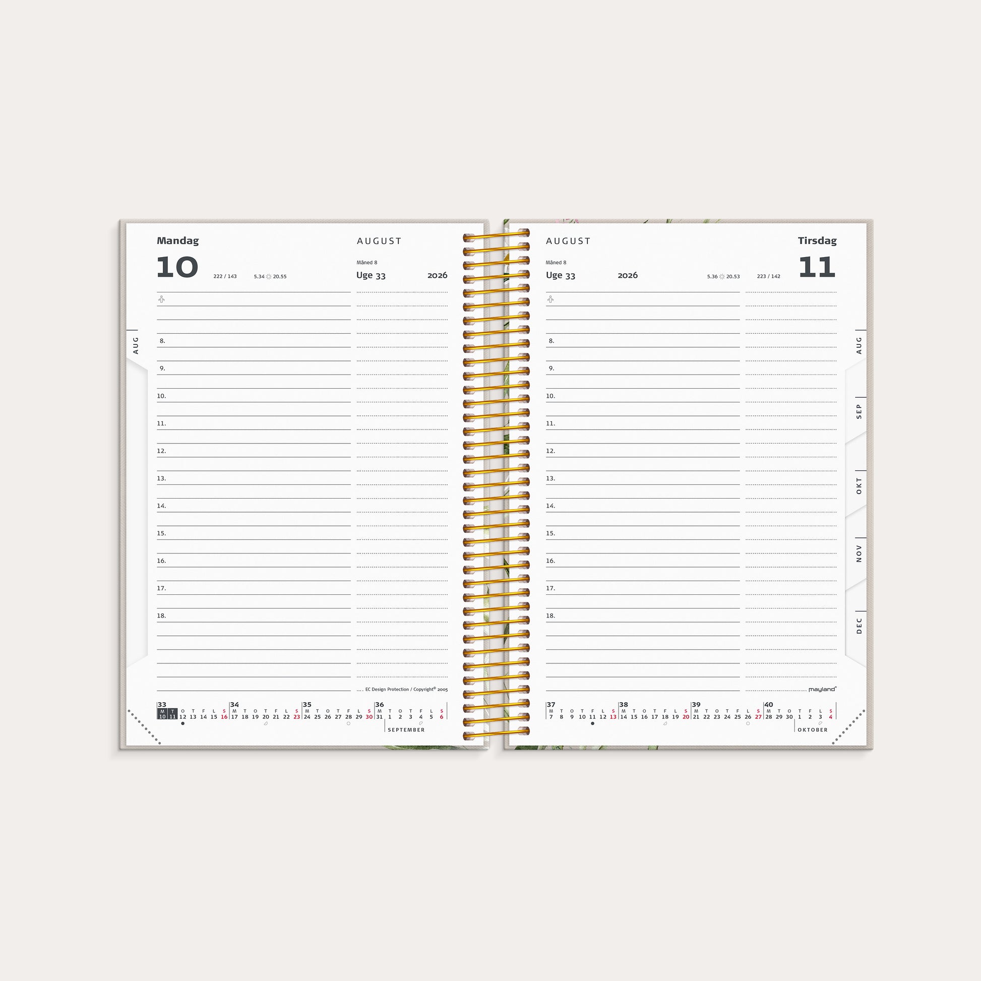 Spiralindbundet kalender for studieåret med et kartonomslag trykt med et fint mønster. Kalenderen er inddelt med en dag pr. side og indeholder et timeopdelt kalenderskema for tidsrummet fra kl. 8-18. I bunden af siderne er der en tidslinje og månedsoversigt.