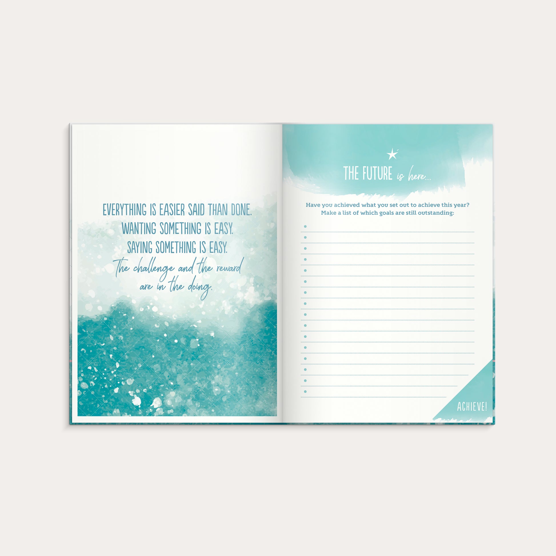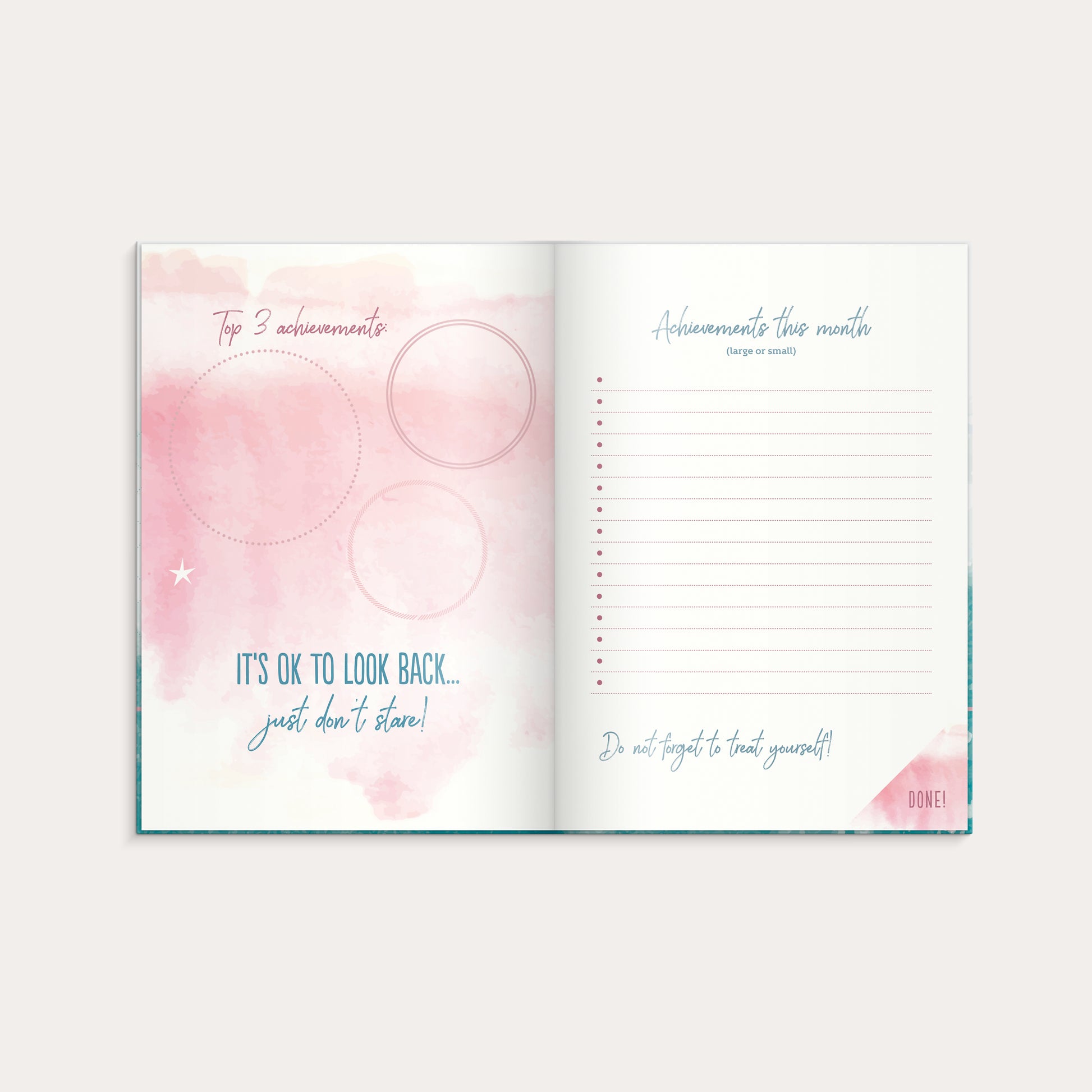 Inbunden odaterad kalender med rosa märkband och hårt omslag i kartong. Ett planeringsverktyg för att uppnå sina drömmar och mål. Kalendern innehåller sidor med inspirerande citat plats för mål, reflektioner och anteckningar. Skriv ner års- och månadsmål. Efter varje månadsslut finns en sida för utvärdering av månaden som gått. Cremefärgat papper. Engelsk inlaga.
