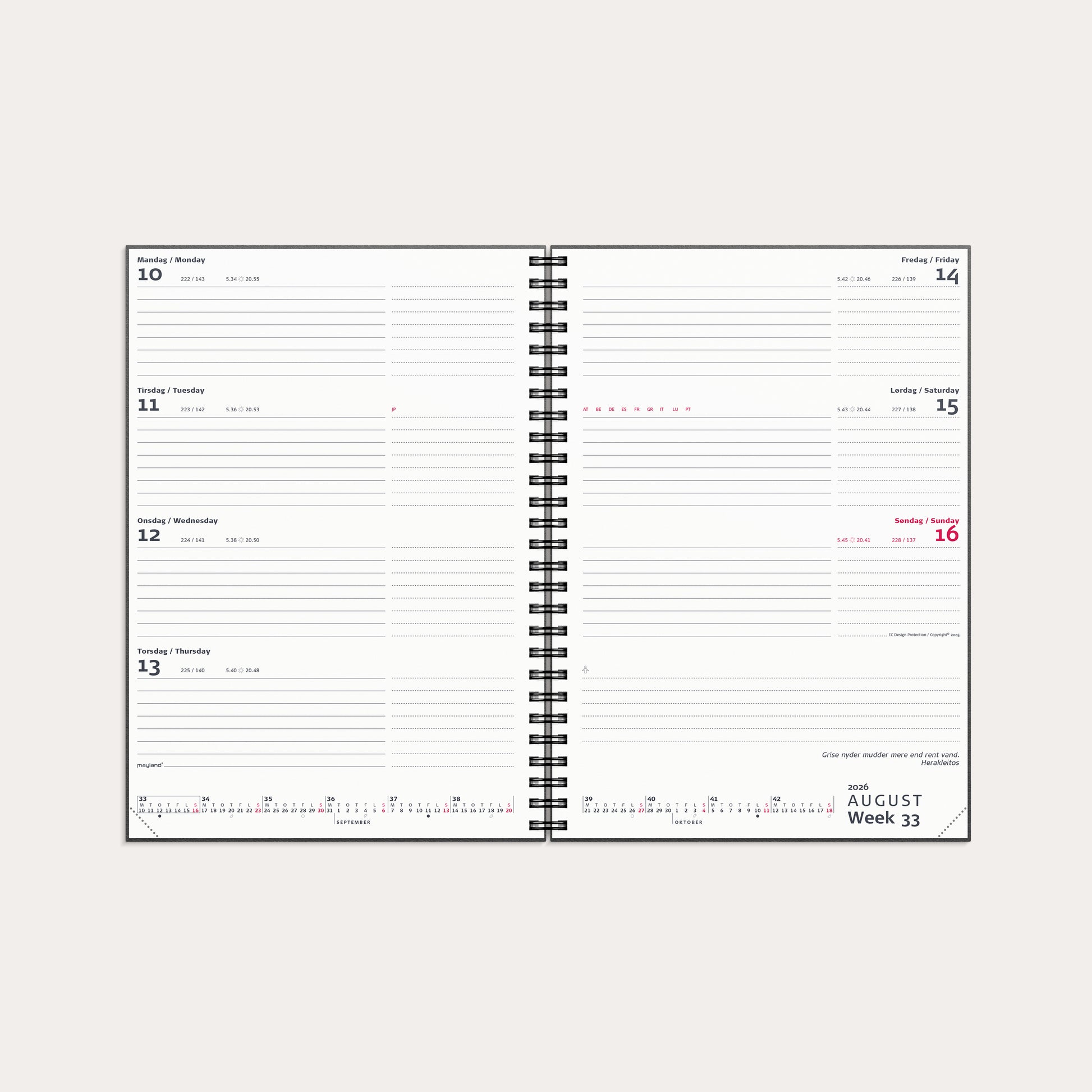 International ugekalender. Kalenderen er spiralbundet med et omslag i kraftigt genbrugskarton og indeholder både danske og engelske betegnelser samt internationale helligdage. Kalenderen har desuden en sort elastik, så den nemt holdes lukket. Kalenderen er inddelt med en uge pr. opslag og indeholder et timeopdelt kalenderskema fra kl. 8-18 i morderne layout, så du får et godt overblik over ugens planer og aktiviteter. Dertil finder du en tidslinje og en månedsoversigt nederst på hvert opslag, en udfoldelig årsplanner, en projektplanner, månedsoversigter, et atlas i farver, masser af praktisk information, lynopslag samt en lomme til løse papirer.