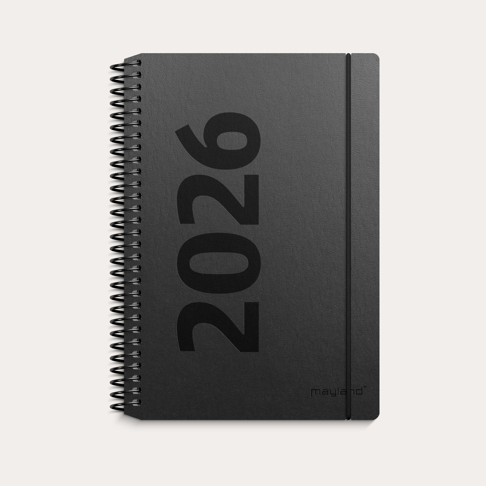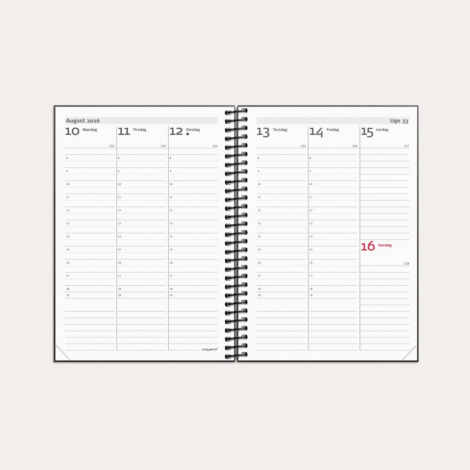 Ugekalender med en sort forside. Kalenderen er spiralbundet med et omslag i genbrugskarton, som giver kalenderen et flot og enkelt udseende. Kalenderen er inddelt med en uge pr. opslag i højformat og indeholder et timeopdelt kalenderskema fra kl. 8-19, hvilket giver dig et overskueligt overblik over ugens aftaler og planer. Dertil finder du kvartalsoversigter, notatsider, lynopslag, praktiske informationer samt en lomme til løse papirer.