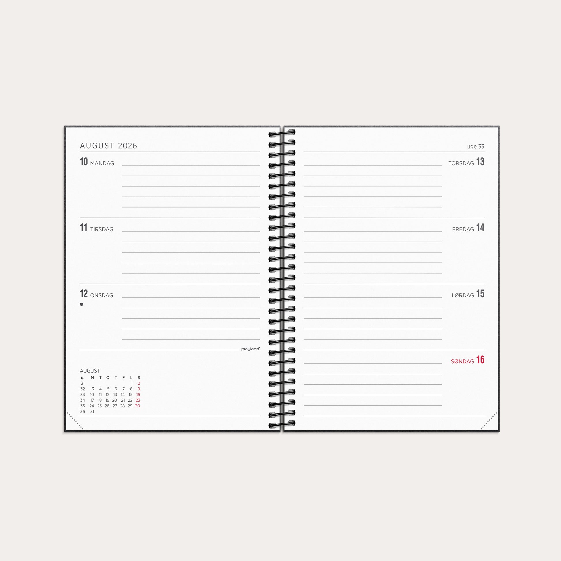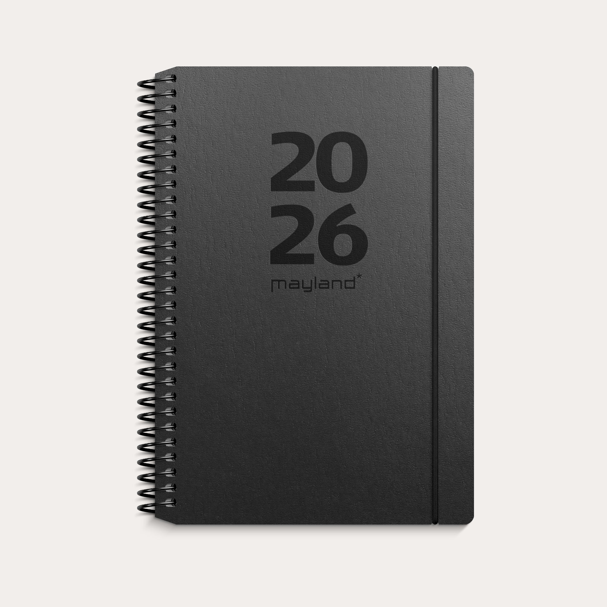 Ugekalender med en sort forside. Kalenderen er spiralbundet med et omslag i genbrugskarton, som giver kalenderen et flot og enkelt udseende. Kalenderen er inddelt med en uge pr. opslag i tværformat, hvilket giver dig et overskueligt overblik over ugens aftaler og planer. Dertil finder du kvartalsoversigter, notatsider, lynopslag, praktiske informationer samt en lomme til løse papirer.