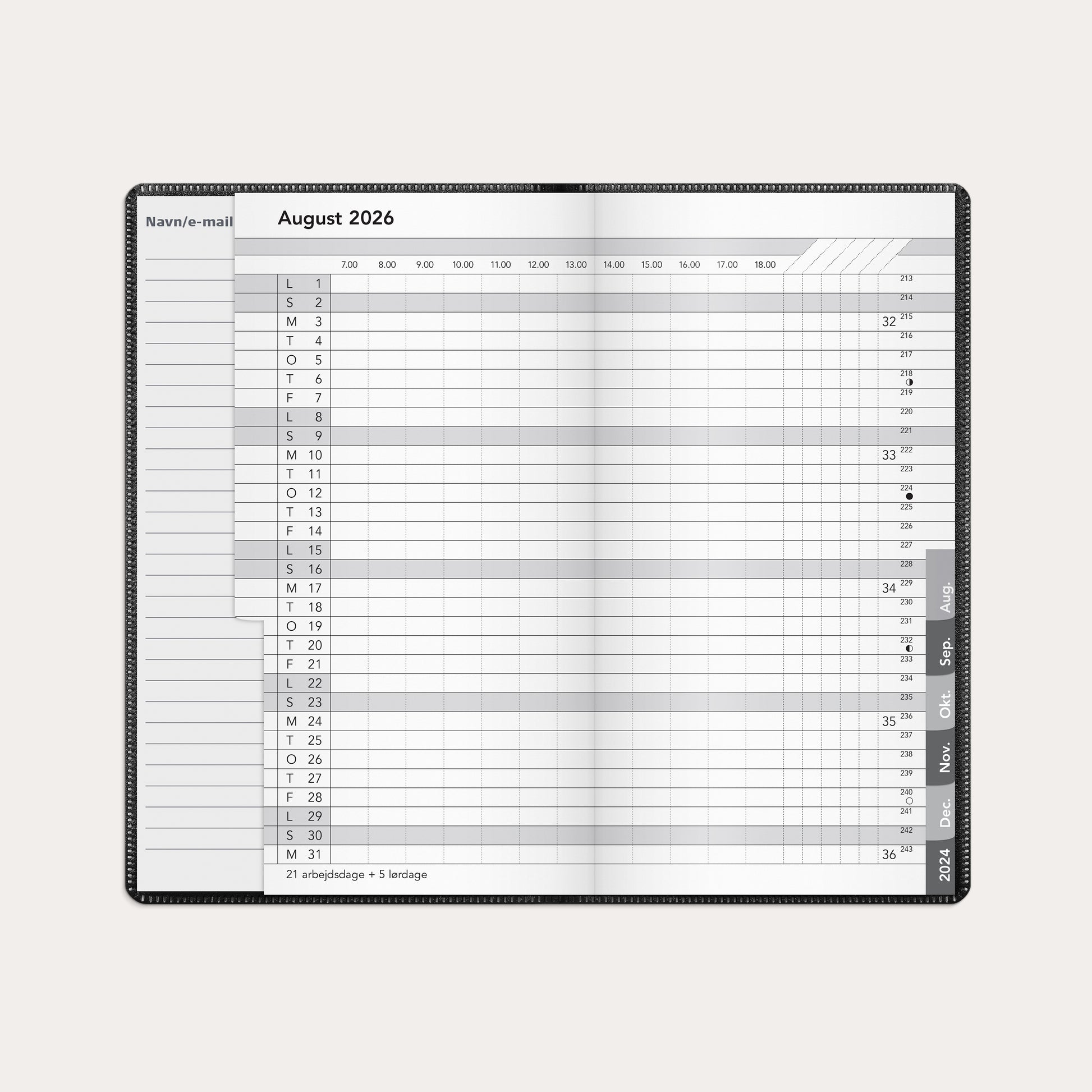 Praktisk månedskalender. Kalenderen er enkel og overskuelig og en del af Maylands Basic-serie, som består af gode kalendere uden fordyrende udstyr. Kalenderen er indbundet med et opslag i sort PP-plast, som giver kalenderen et pænt udseende. Kalenderen er inddelt med en måned pr. opslag og indeholder et timeopdelt kalenderskema fra kl. 8-18, som giver dig et godt og overskueligt overblik over måneden og alle dens aktiviteter. Til højre i månedsopslagene er der plads til at lave lister og en angivelse af, hvilket nummer de enkelte dage udgør af årets 365 dage. Desuden er der i bunden af hvert opslag skrevet, hvor mange arbejdsdage hver enkelt måned indeholder.