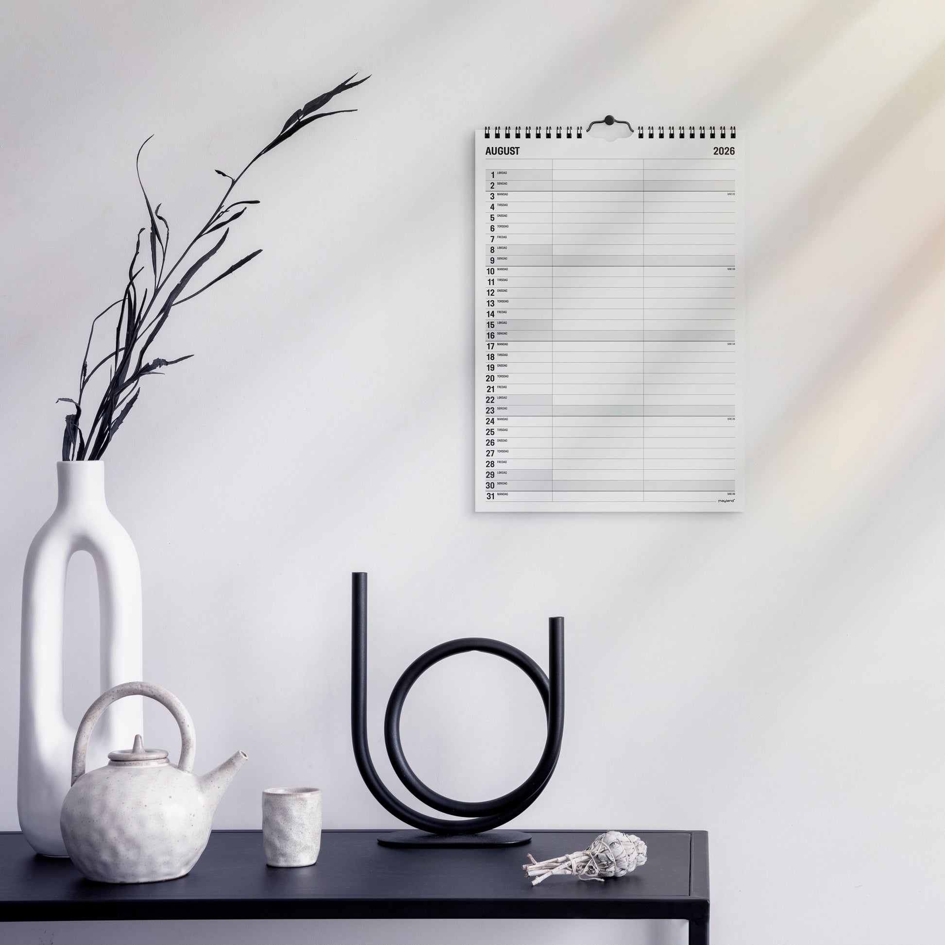 Familiekalender i sort/hvidt, stilrent design. Kalenderen er inddelt med en måned pr. side. Hver måned er opdelt i 2 kolonner, så hvert familiemedlem har sin egen kolonne hver dag. På den måde kan du hurtigt og nemt skabe et overskueligt overblik over hele familiens aktiviteter og aftaler.