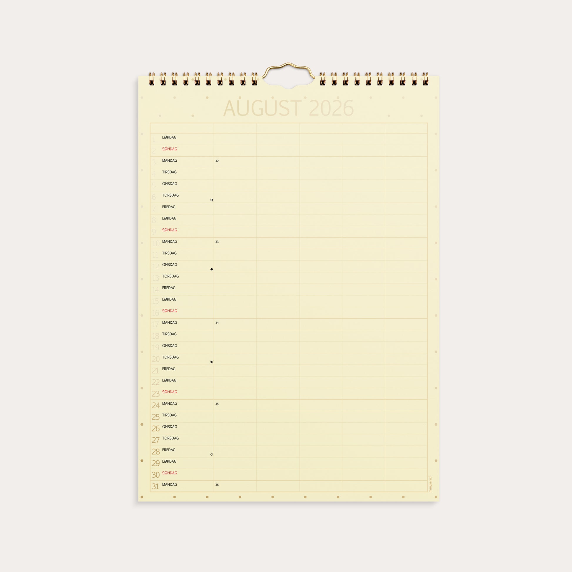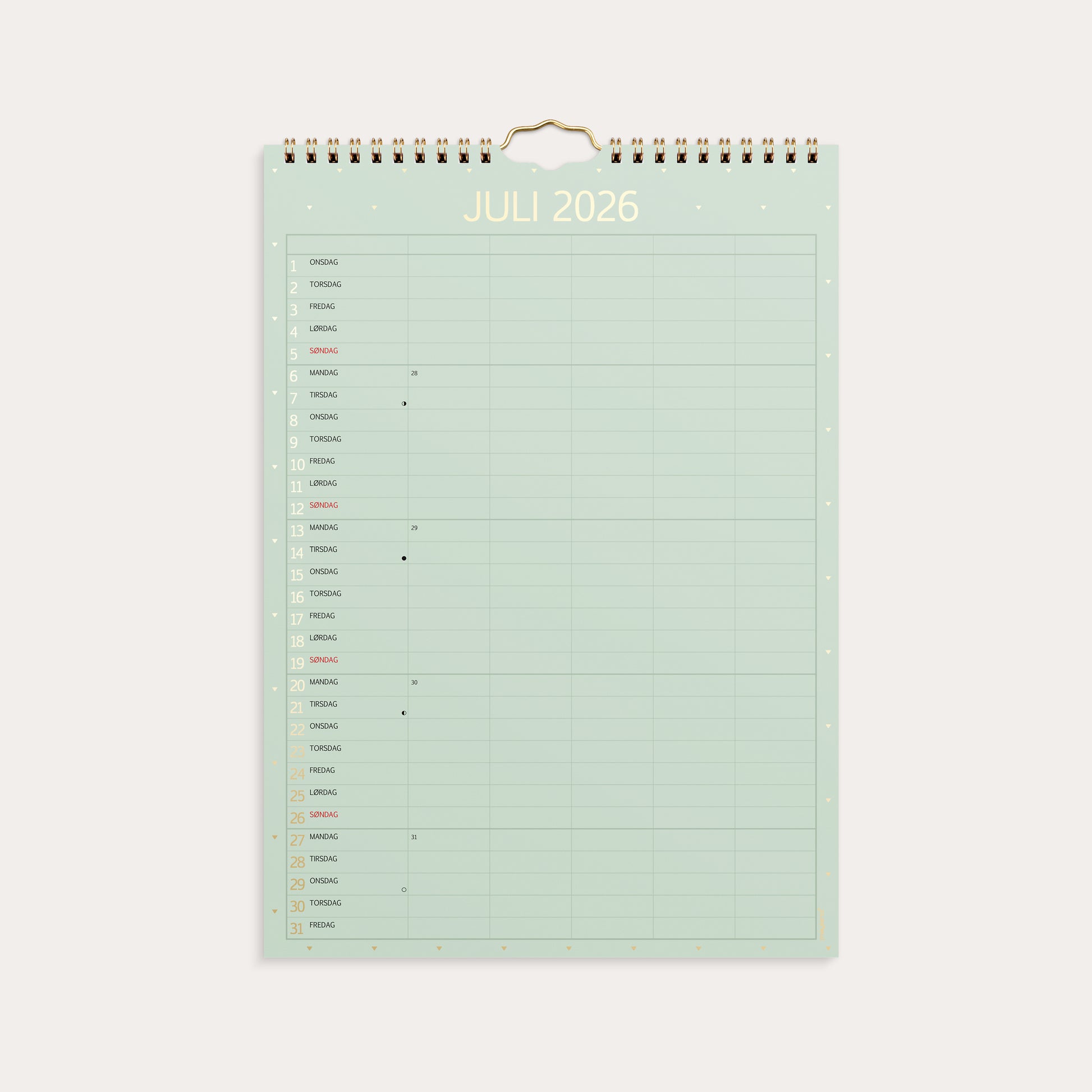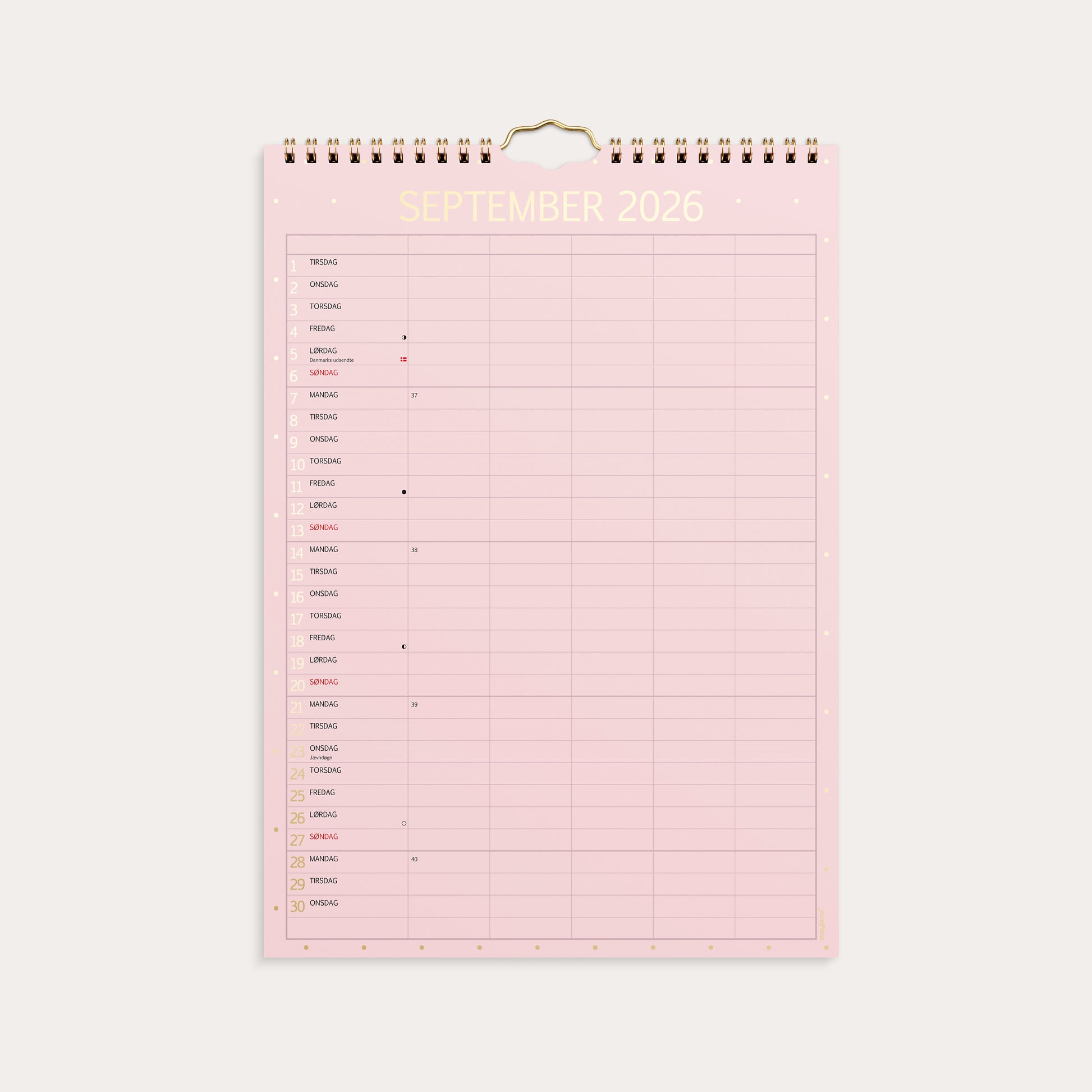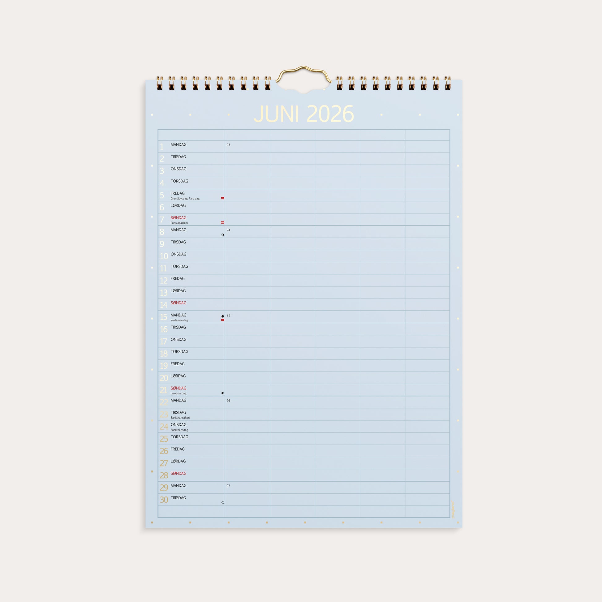 Familiekalender i praktisk og elegant design med skiftende farver. Kalenderen er inddelt med en måned pr. side. Hver måned er opdelt i 5 kolonner, så hvert familiemedlem har sin egen kolonne hver dag. På den måde kan du hurtigt og nemt skabe et overskueligt overblik over hele familiens aktiviteter og aftaler.