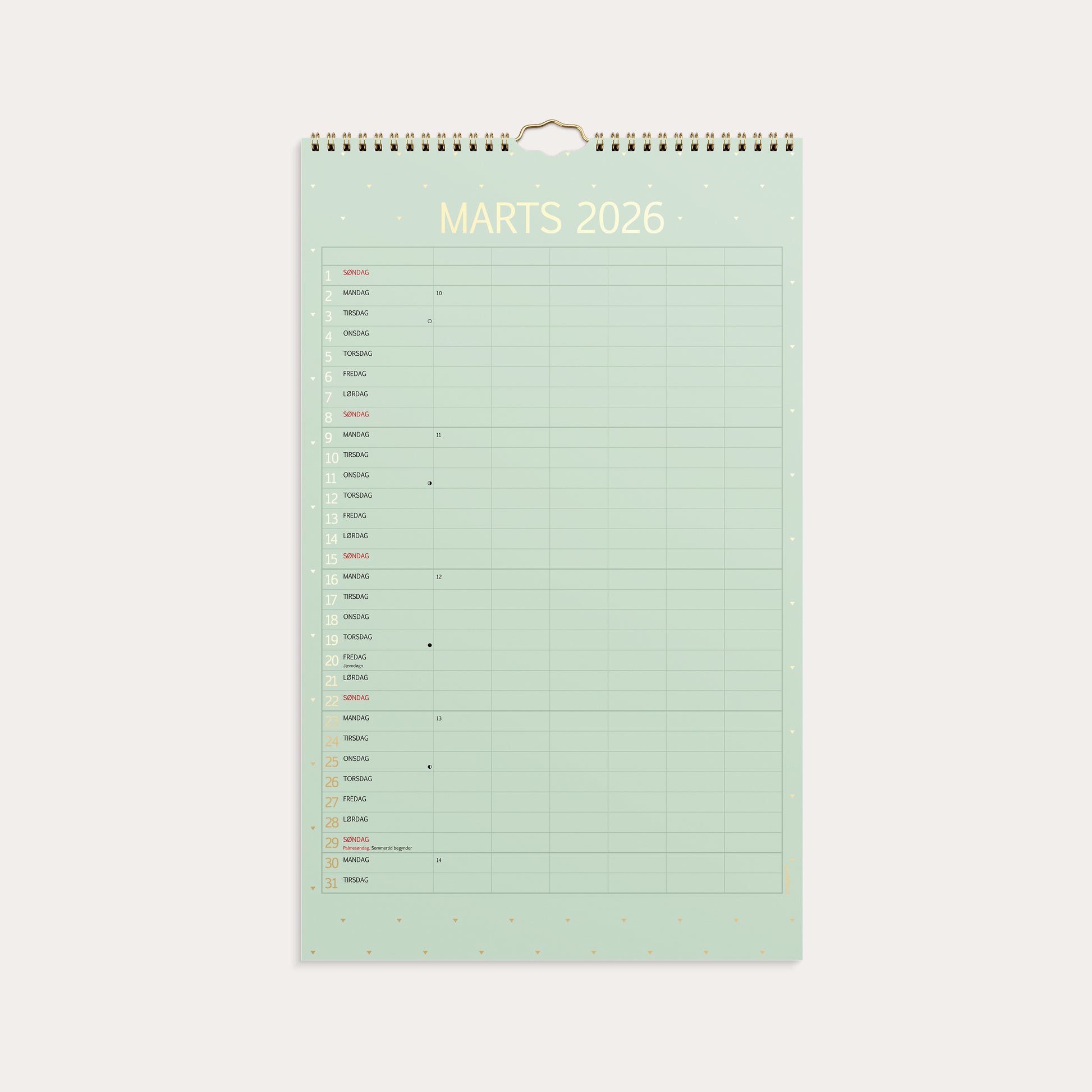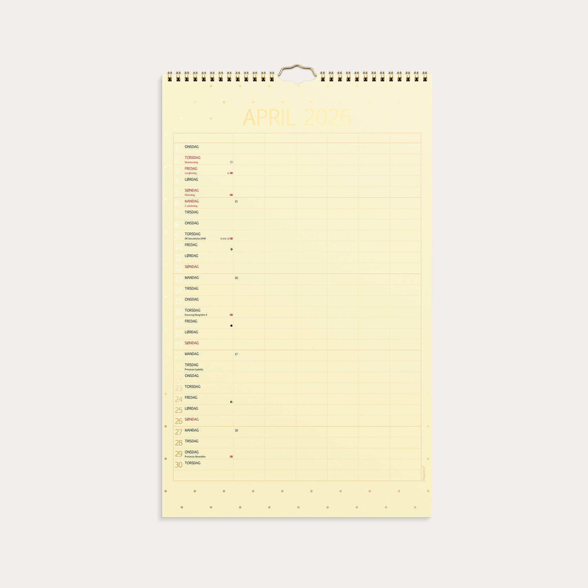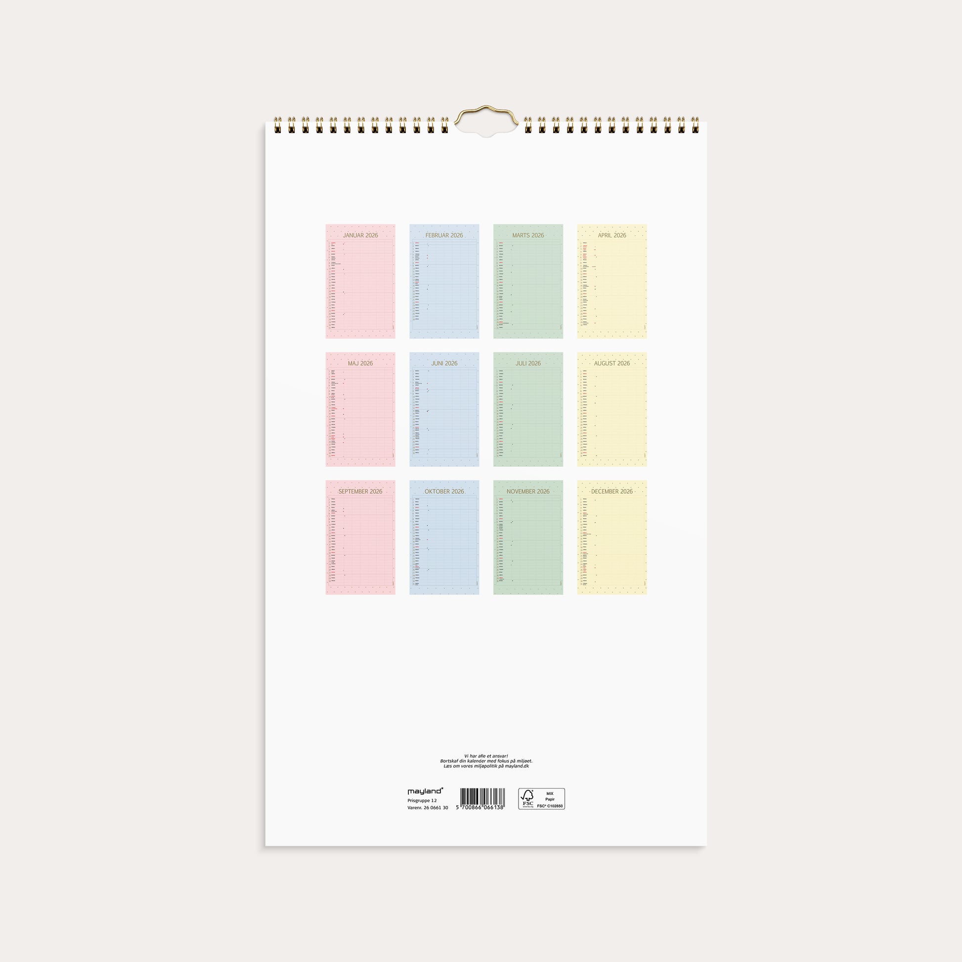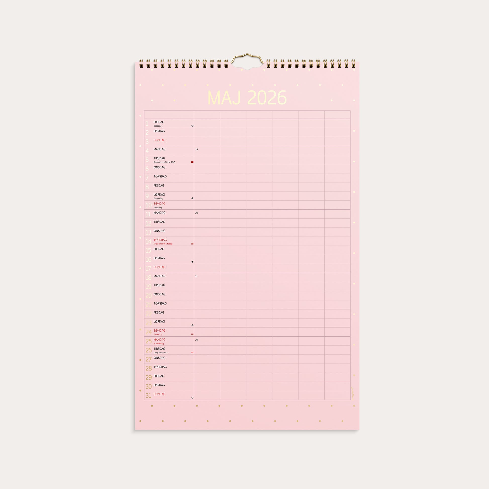 Familiekalender i praktisk og elegant design med skiftende farver. Kalenderen er inddelt med en måned pr. side. Hver måned er opdelt i 6 kolonner, så hvert familiemedlem har sin egen kolonne hver dag. På den måde kan du hurtigt og nemt skabe et overskueligt overblik over hele familiens aktiviteter og aftaler.