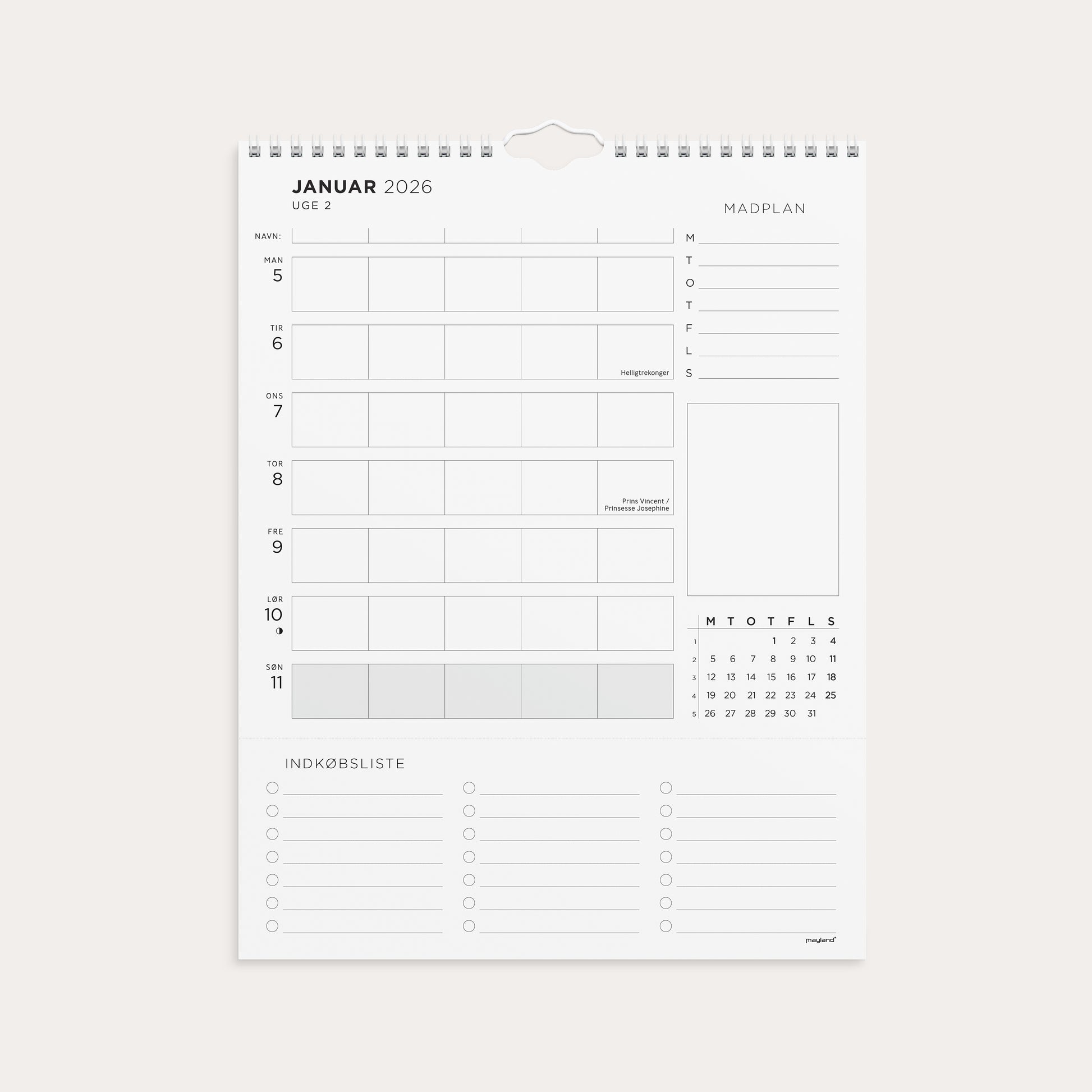Familiekalender i karton til vægophæng. Vægkalenderen er spiralindbundet og har ugeopslag. Hver uge er opdelt i 5 kolonner, så hvert familiemedlem har sin egen kolonne og skriveplads til at notere aktiviteter og aftaler. Plads til ugens madplan for at lette madindkøb. Kalenderen har desuden af afrivbar del til fx indkøbs- huske- eller to-do-lister, en månedsoversigt på hvert ugeopslag og notatfelt samt en fødselsdagsoversigt.