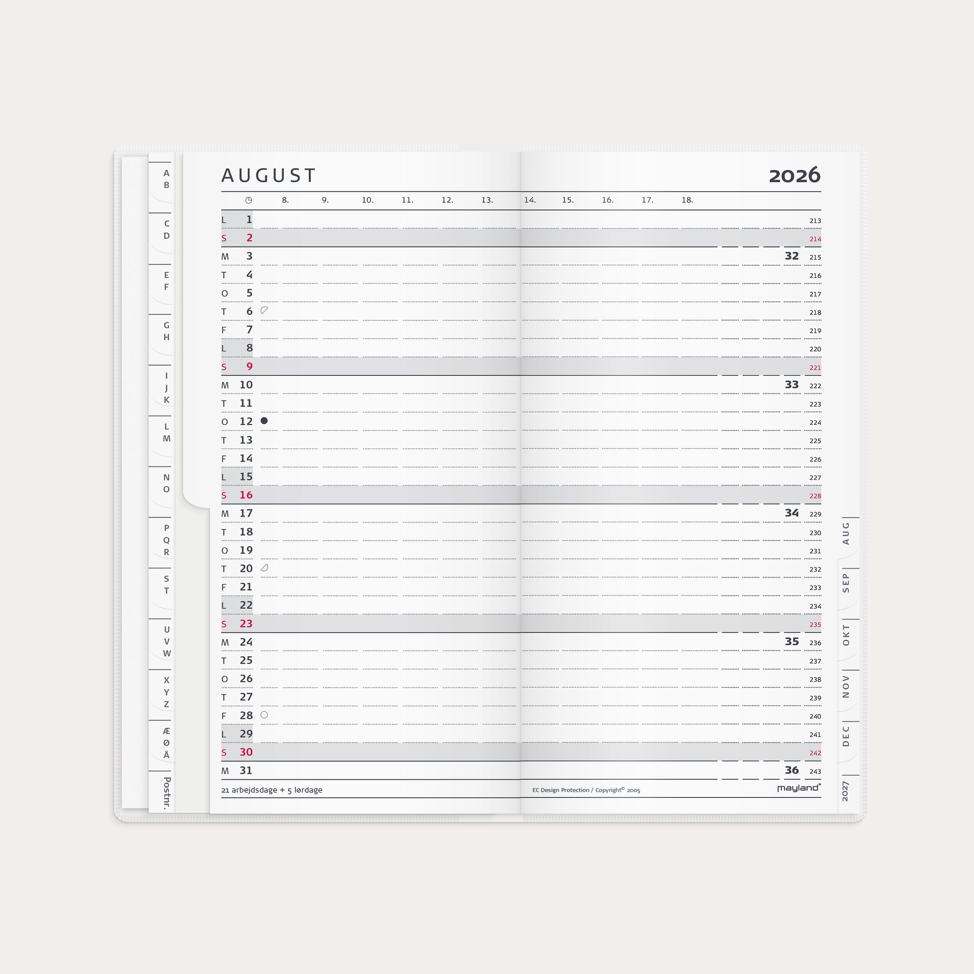 Den originale index planner. Kalenderen er indbundet med et omslag i PP-plast og en illustrativ forside, som giver kalender et flot udseende. Kalenderen er inddelt med en måned pr. opslag og indeholder et timeopdelt kalenderskema fra kl. 8-18, så du hurtigt kan danne dig et overblik over månedens planer og aftaler. I bunden af månedsopslagene er der angivet, hvor mange arbejdsdage der er den pågældende måned. Du finder desuden årsoversigter og diverse praktiske informationer til højre i kalenderen, mens du til venstre finder et adresse- og telefonregister. Dertil finder du en praktisk lille notesblok samt plads til 3 kreditkort.
