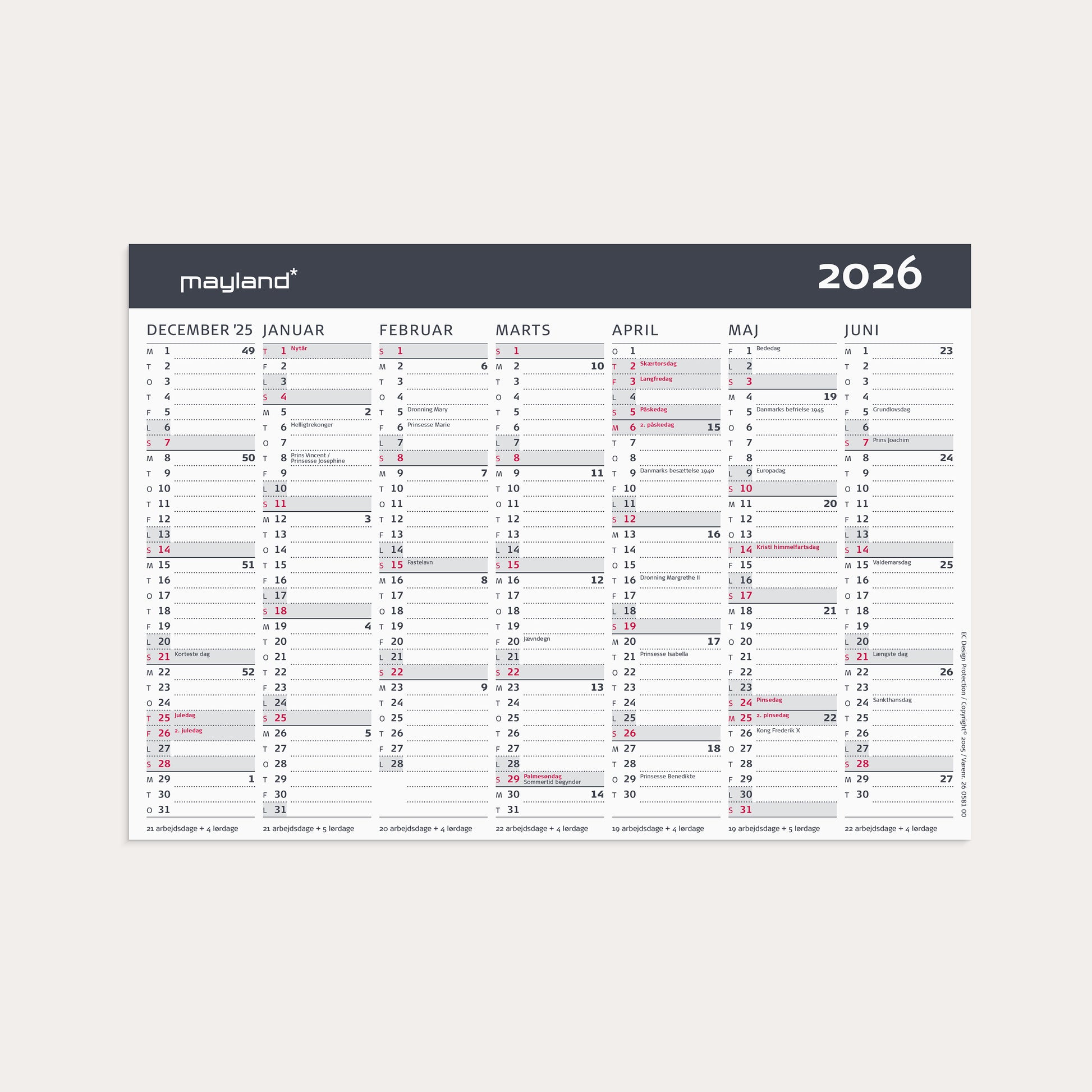 Vendbar bordkalender, der kan stå op. Kalenderen, der er i karton, har et moderne design og en 2x7 måneders oversigt, så du kan se over et halvt år ad gangen. I bunden af kalenderen er der angivet antallet af arbejdsdage for hver måned. Bordkalenderen er perfekt til at have stående på skrivebordet, så du hurtigt og nemt kan skabe dig et godt og overskueligt overblik over året og alle dets aktiviteter.