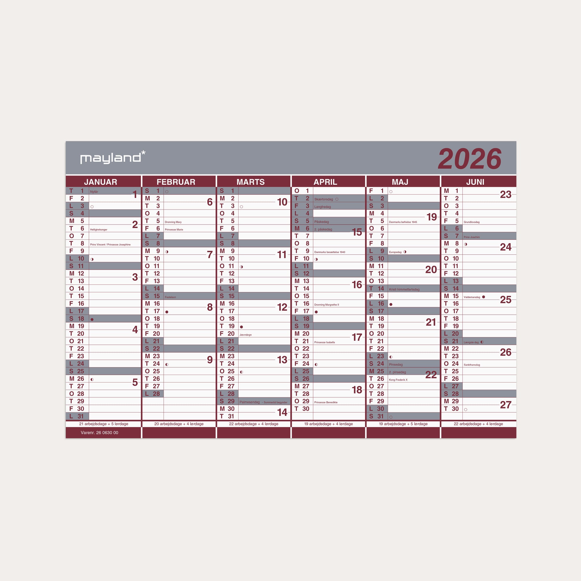 Smart og fleksibel dobbelthalvårskalender som består af to selvstændige halvårskalendere, en for januar-juni og en for juli-december. De to kalendere gælder tilsammen for hele året og kan hægtes sammen og kan evt. hængtes sammen med flere år, for et bedre og større overblik. 3 stk. ophængskroge medfølger.