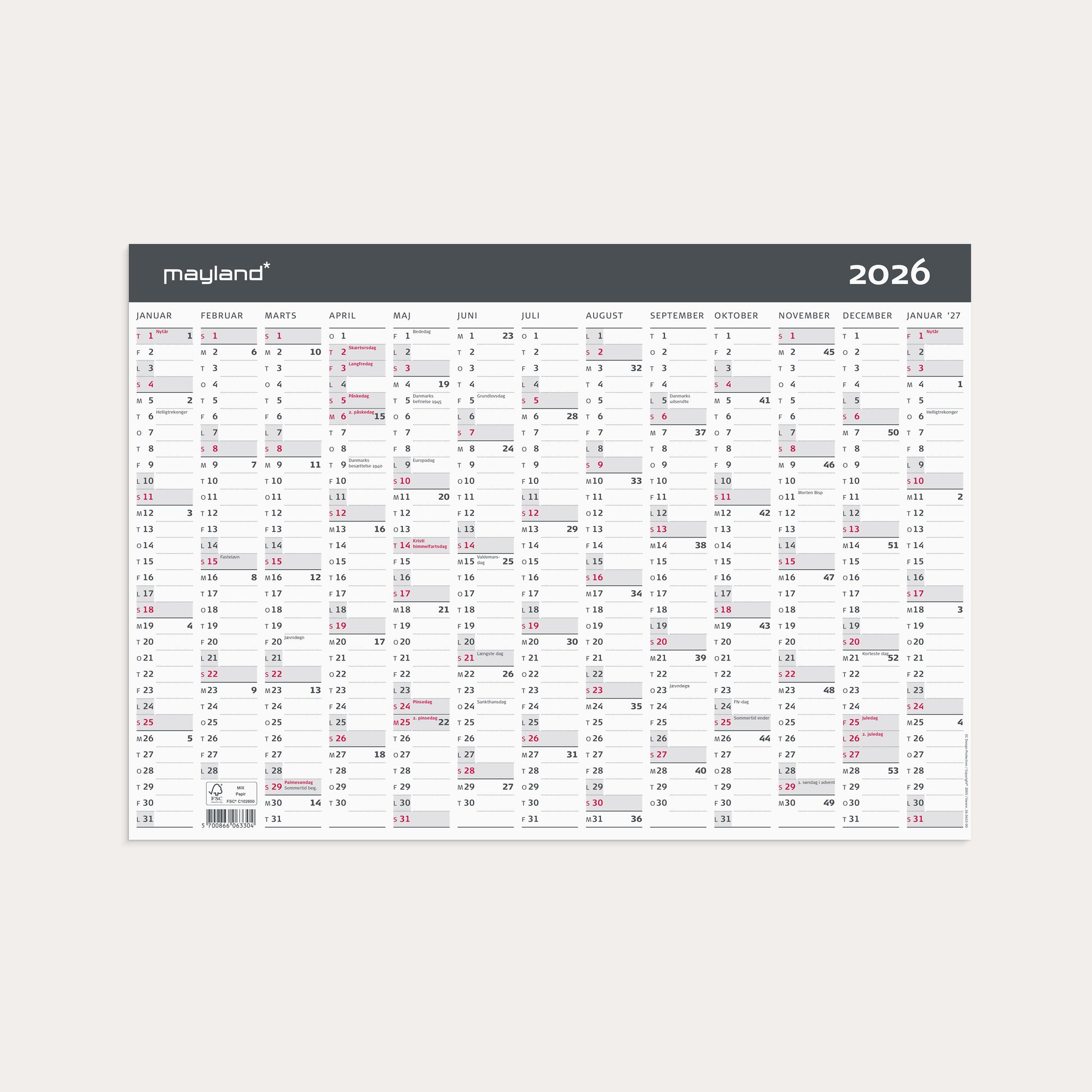 Kontorkalender i karton og moderne design med 13 månedsoversigt. Vægkalenderen giver dig en oversigt over alle 12 måneder i året samt for januar det efterfølgende år. Med årskalenderen kan du hurtigt og nemt skabe et godt og overskueligt overblik over året og alle dets aktiviteter.