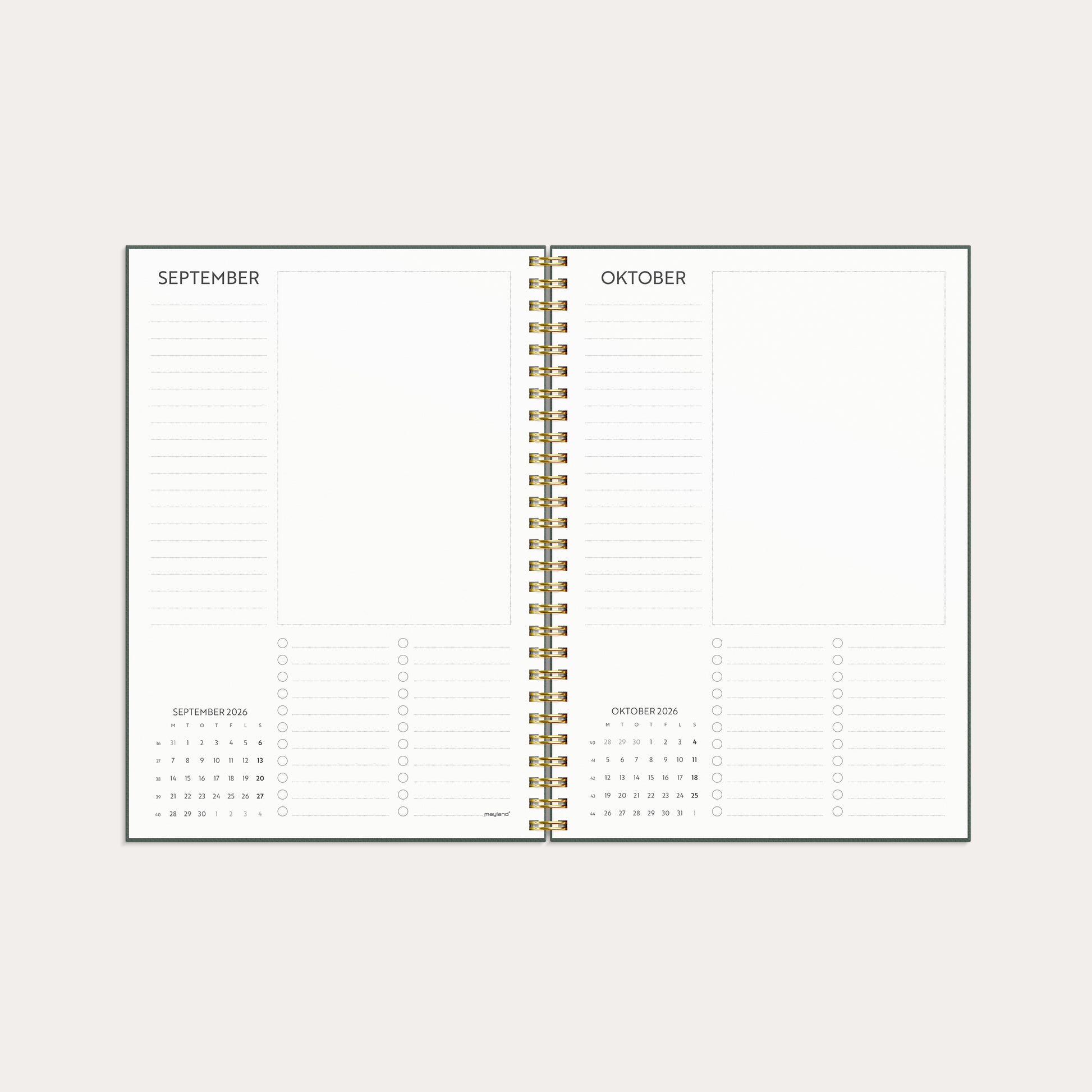 Ugekalender med en flot forside. Kalenderen er spiralbundet med et omslag i karton, som giver kalenderen et enkelt og moderne udseende. Kalenderen er inddelt med en uge pr. opslag i højformat og indeholder et timeopdelt kalenderskema fra kl. 7-22, så du hurtigt kan overskue ugens planer og aktiviteter. Den stilrene kalender er oplagt til dig med en hektisk hverdag, der gerne vil have struktur på dagligdagen. De mange to do-lister samt prikkede og linjerede sider giver dig plads til at notere gøremål, lave huskelister og skrive refleksioner ned. Desuden finder du halvårs- og kvartalsoversigter, månedsoversigter, notatsider, flytbare faner samt en lomme til løse papirer bagerst i kalenderen.