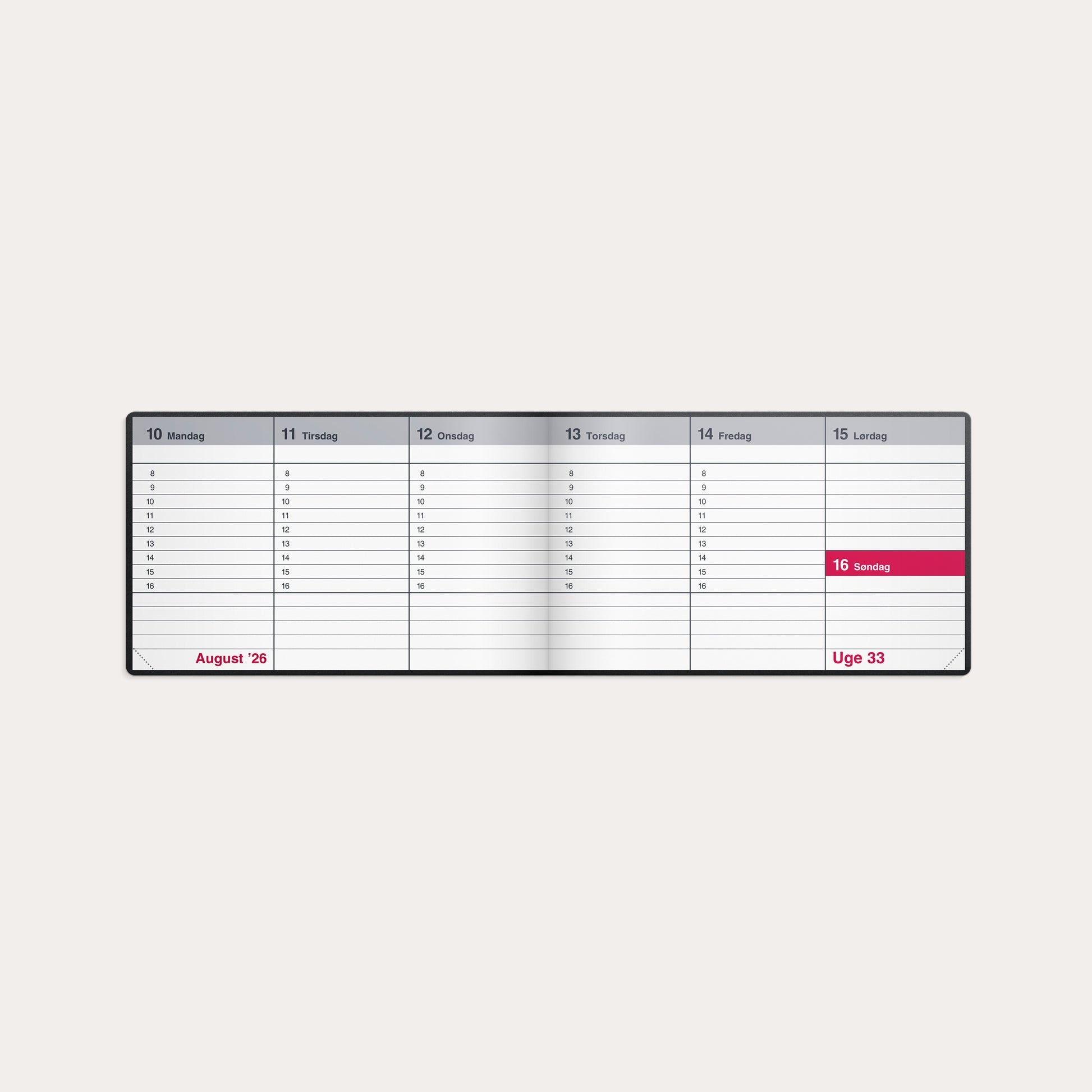 Mini bordkalender. Bordkalenderen kommer i en praktisk og smart vinylmappe, som måler 14,8 x 9 cm, når den er lukket, og 29,6 x 9 cm, når den er opslået. Minikalenderen giver dig god skriveplads og er perfekt at have liggende på skrivebordet eller at have med i lommen, når du er på farten. Kalenderen viser en uge pr. opslag og indeholder et timeopdelt ugekalenderskema fra kl. 8-16, så du nemt kan danne dig et overblik over ugens planer og aktiviteter. Dertil finder du et telefon- og adresseregister samt en årsplan.