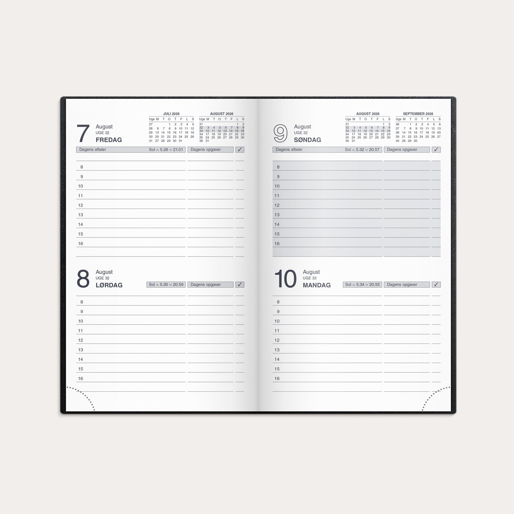 Smart noteringskalender. Kalenderen er indbundet med et omslag i kunstskind, som giver kalenderen et flot og elegant udseende. Kalenderen er inddelt med to dage pr. side og indeholder et klassisk, timeopdelt kalenderskema fra kl. 8-16, så du nemt kan danne dig et overblik over dagenes planer og aktiviteter. Dertil finder du månedsoversigter og en praktisk hjørneperforering, så du lettere kan holde styr på dagene.