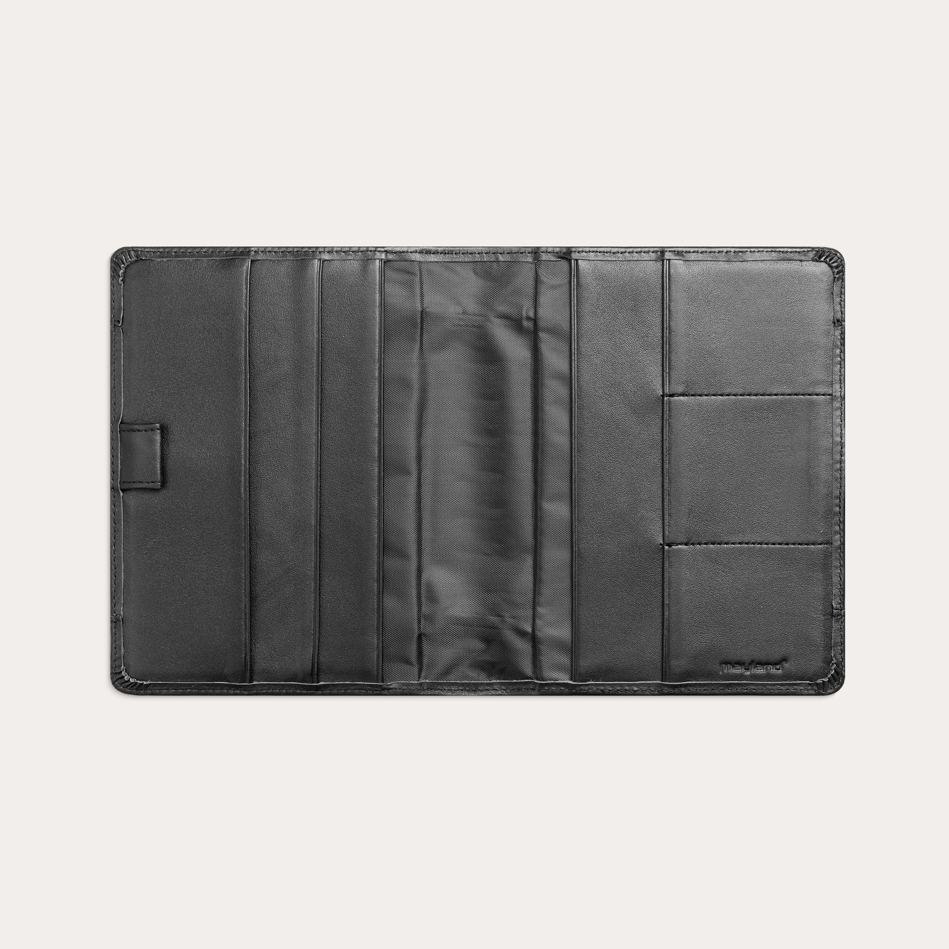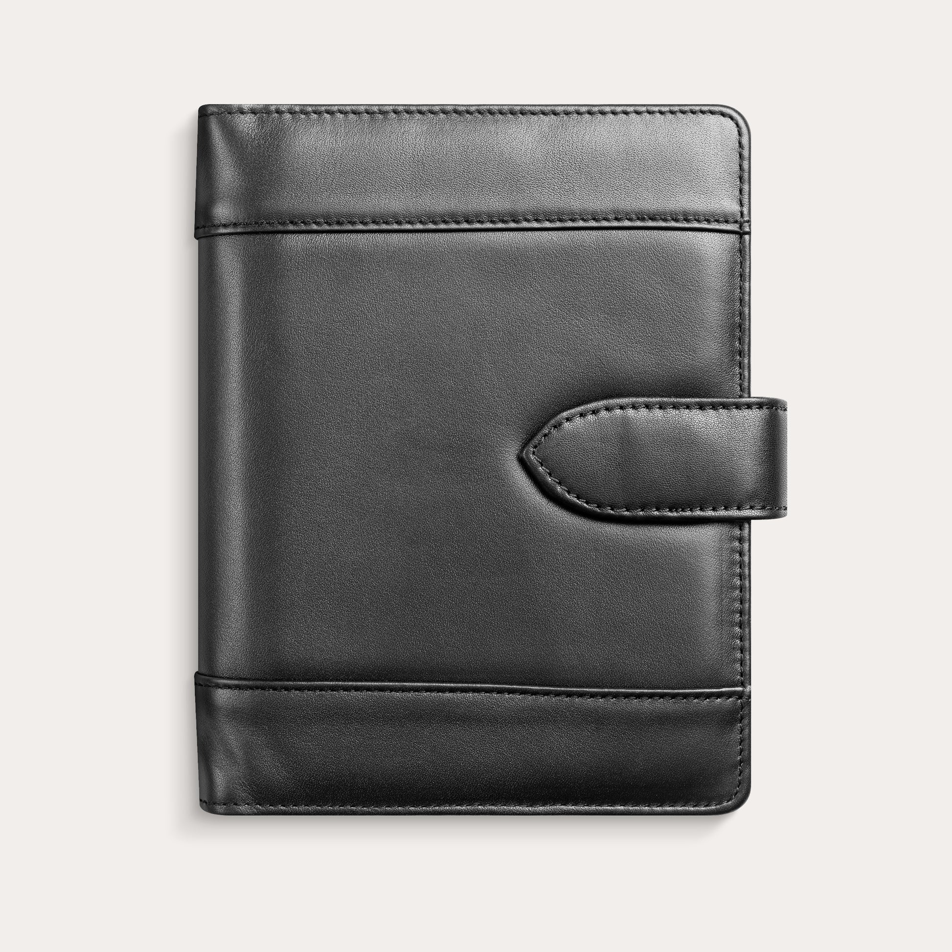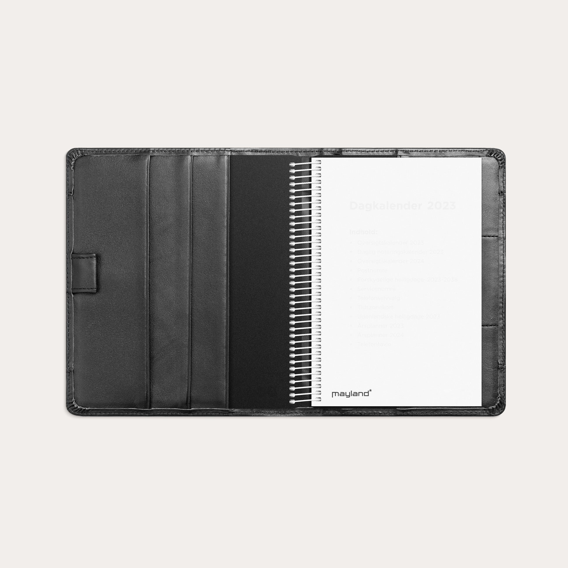 Omslag (uden indhold) i ægte skind til spiralkalender 11,7 x 17,1 cm . Flot og elegant, løst kalenderomslag, som har en fin lukkestrop samt lommer til kreditkort og løse papirer. Gør din normale spiralkalender luksuriøs med dette læderomslag.