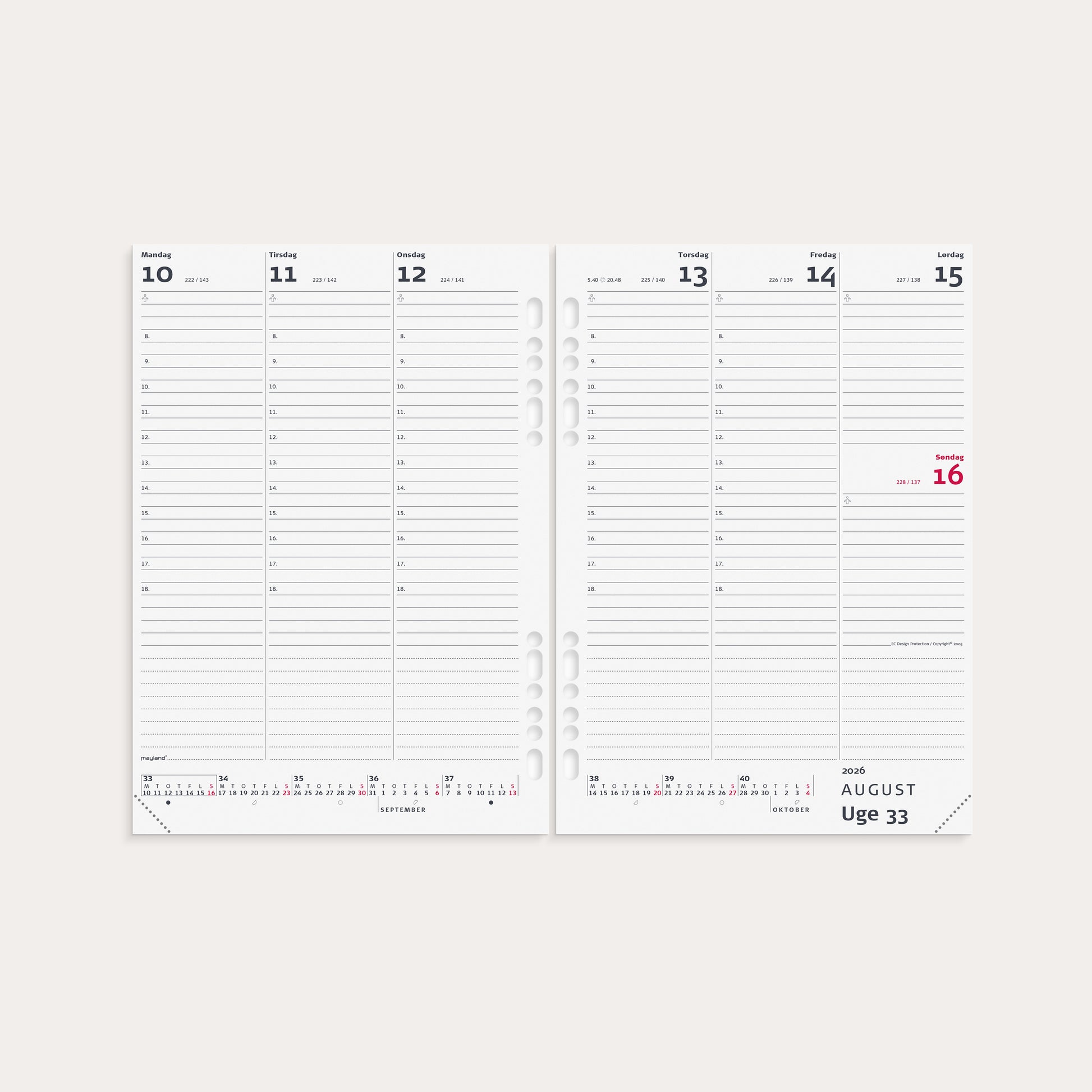 Ugekalender refill i højformat til din A5 systemkalender. Kalender-refillen har multihuller. Kalenderen er inddelt med en uge pr. opslag og indeholder et timeopdelt kalenderskema i moderne layout fra kl. 8-18, så du nemt kan overskue ugens planer og aktiviteter. Dertfil finder du nederst på hvert opslag en tidslinje og månedsoversigt. Kalenderen indeholder desuden en udfoldelig årsplanner, projektplanner, atlas i farver, masser af praktisk information, lynopslag samt separat mappe med index planner og telefonregister.