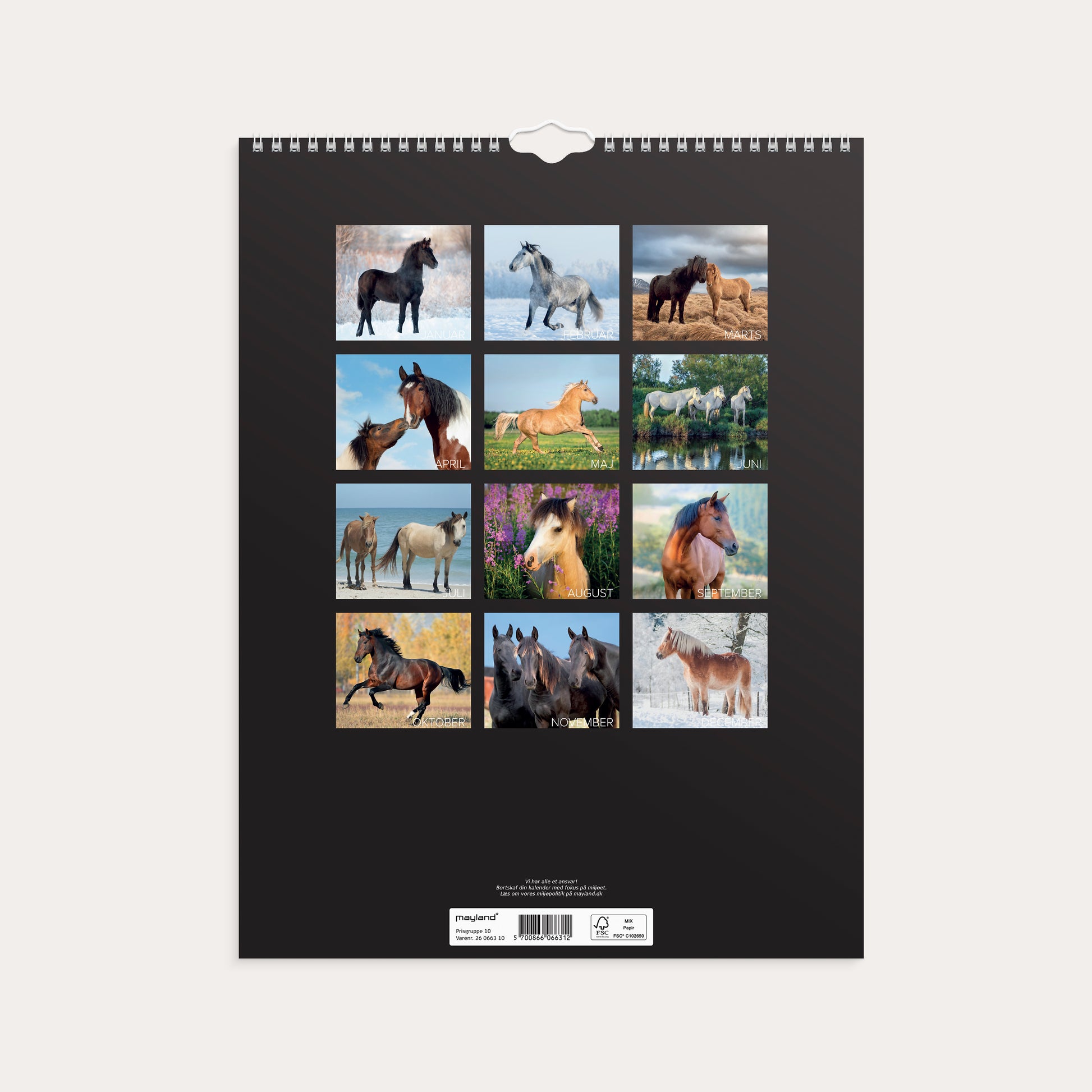 Vægkalender i karton med flotte billeder af heste. Kalenderen er spiralindbundet og giver dig en oversigt over 1 måned ad gangen med masser af plads til noteringer, så du hurtigt og nemt kan skabe et godt overblik over den enkelte måned.