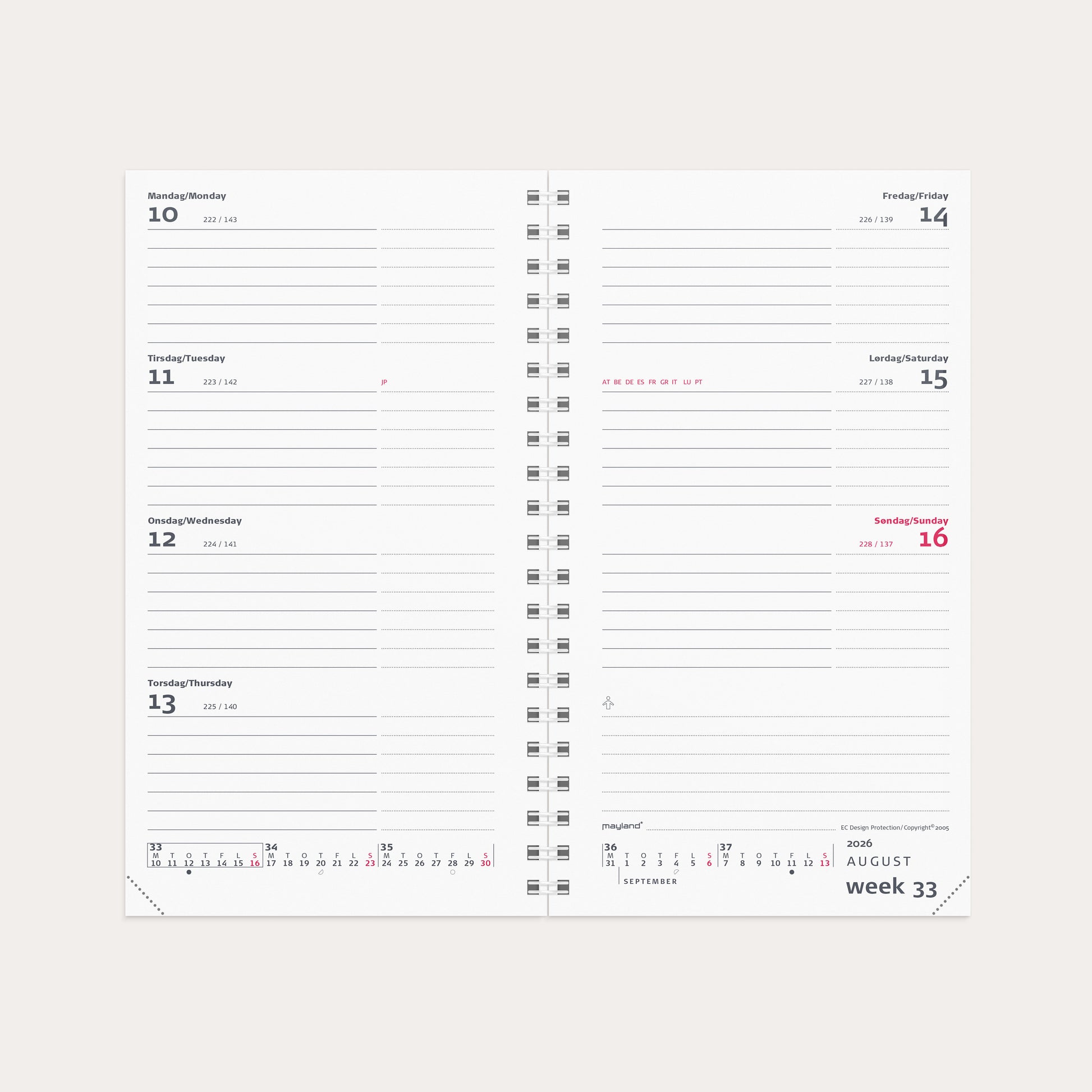 Refill til din internationale ugekalender. Kalender-refillen indeholder både danske og engelske betegnelser og tekster samt en angivelse af nationale helligdage. Refillen er inddelt med en uge pr. opslag og indeholder et timeopdelt kalenderskema fra kl. 8-16, så der er masser af plads til at skrive dagens planer og aktiviteter. Dertil finder du en tidslinje og månedsoversigt nederst på hvert opslag og en udfoldelig årsoversigt.