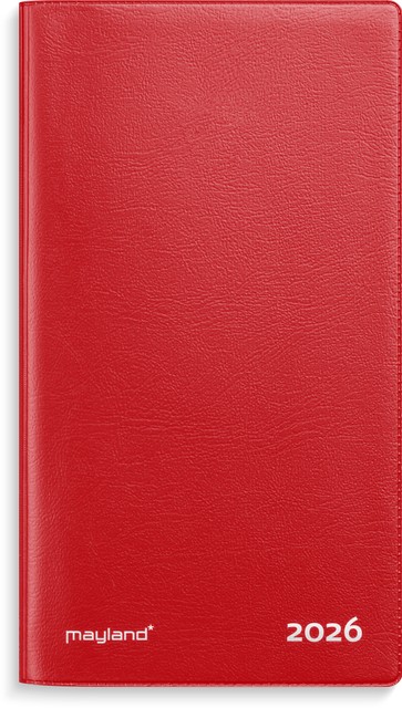 Mål: 173 x 99 x 7 mm. Layout: Måned/opslag. Tværformat. Timeinddeling 8-18. Kalendarium: 2026-01-01 – 2026-12-31. Omslag: Plast. Hæftet. Indhold: Årsoversigter. Sideantal: 36. Miljøoplysninger: FSC®. Varemærke: Mayland.