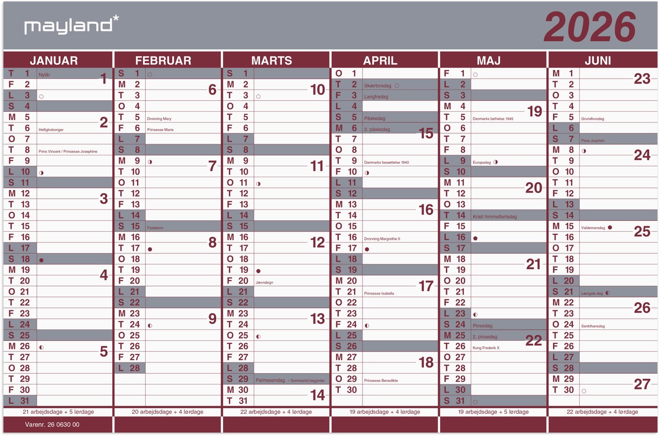 Mål: 290 x 439 x 2 mm. Layout: Halvår/side. Tværformat. Kalendarium: 2026-01-01 – 2026-12-31. Indhold: 3 plastkroge. Sideantal: 2. Miljøoplysninger: FSC®. Varemærke: Mayland.