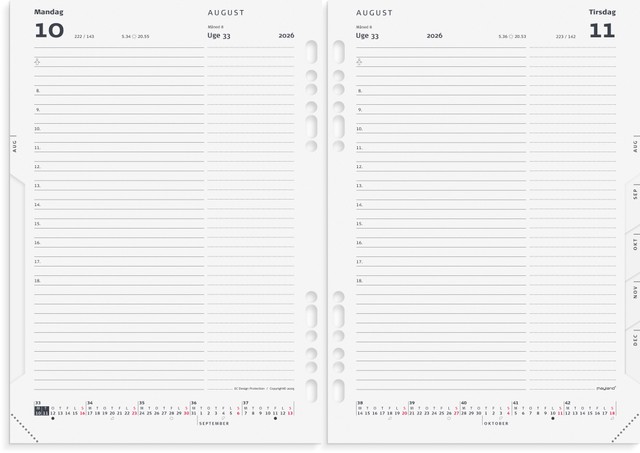 Dagskalender refill til din A5 systemkalender. Kalender-refillen har multihuller og masser af skriveplads, så du nemt kan overskue dagens planer og aktiviteter. Kalenderen er inddelt med en dag pr. side og med et timeopdelt kalenderskema i moderne layout fra kl. 8-18. Dertil finder du en tidslinje og månedsoversigt nederst på hvert opslag, en udfoldelig årsplanner, projektplanner, atlas i farver, masser af praktisk information, lynopslag samt separat mappe med index planner og telefonregister.